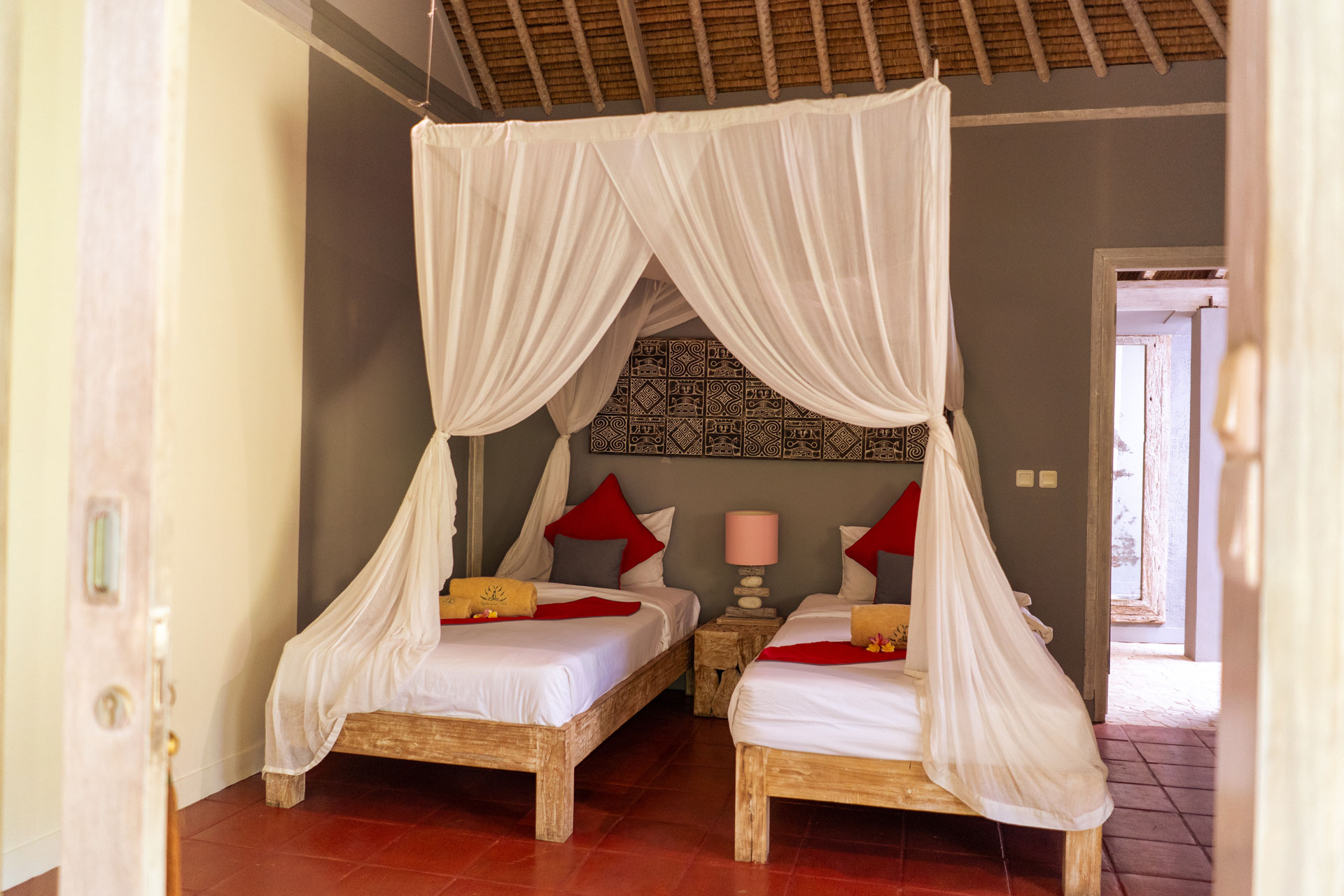A family of 80 sqm with a patio consisting of a 2 bedroom bungalow is connected by a door that can accommodate a family of 4 people. A king size and twin bed equipped with mosquito net. Every room has its own bathroom area. Enjoy a cup of coffee or tea that is provided in the room at the patio with the pool and river view. Internet router for the high speed connection for your needs in every room.