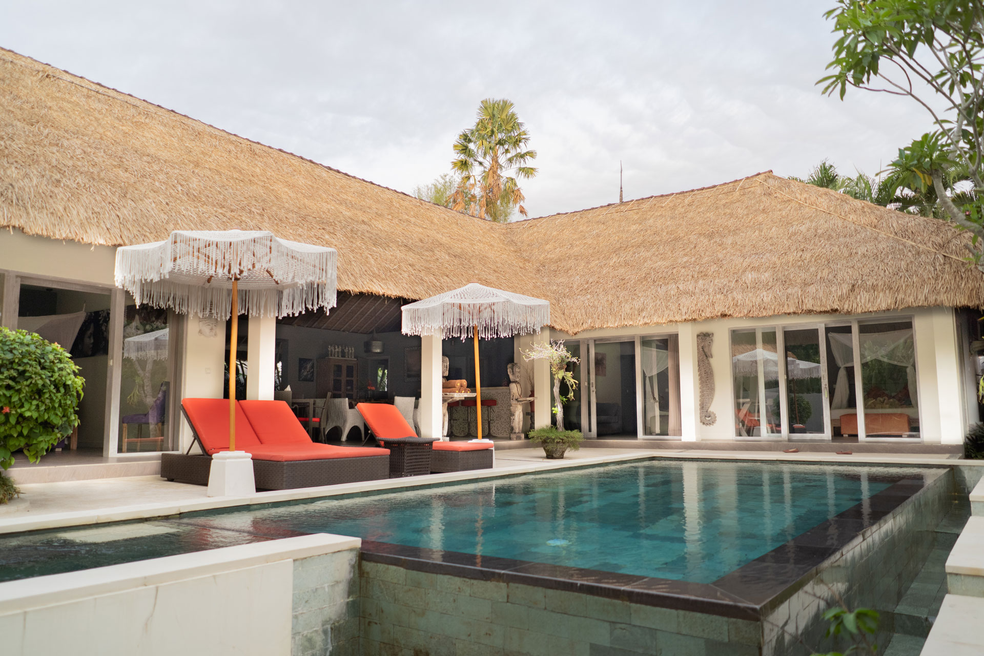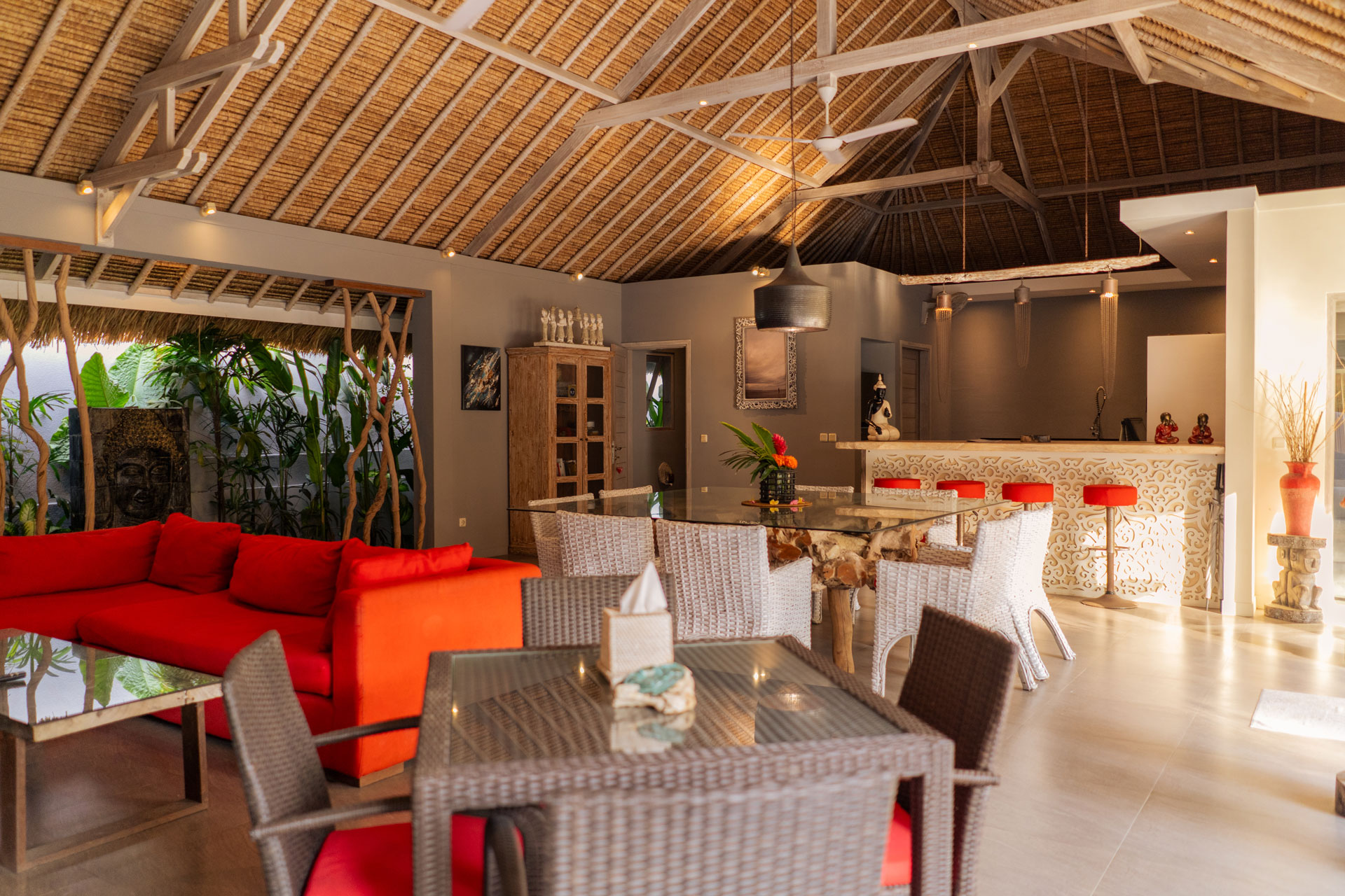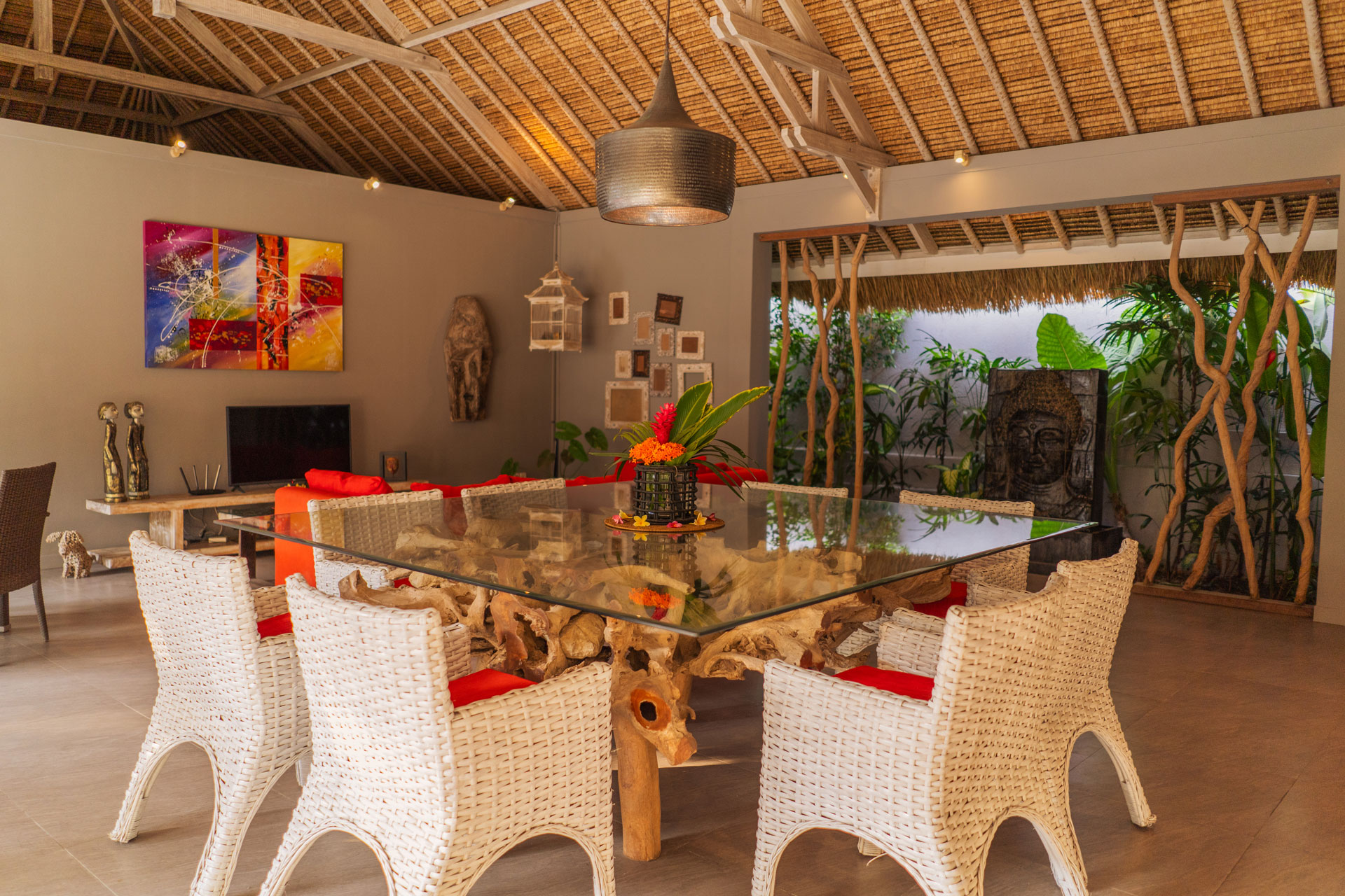 Our 420 sqm 3 bedroom villa with a large private swimming pool and a very well-equipped modern kitchen. Experience dining at a villa that is prepared by a private chef based on your request. A wonderful dining area and living room with flat screen TV. King size bed with mosquito net and a wide outdoor bathroom area in all rooms.