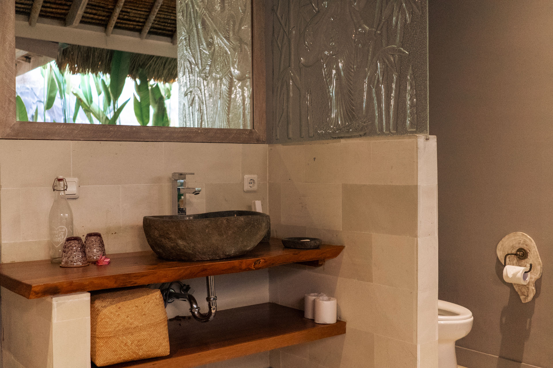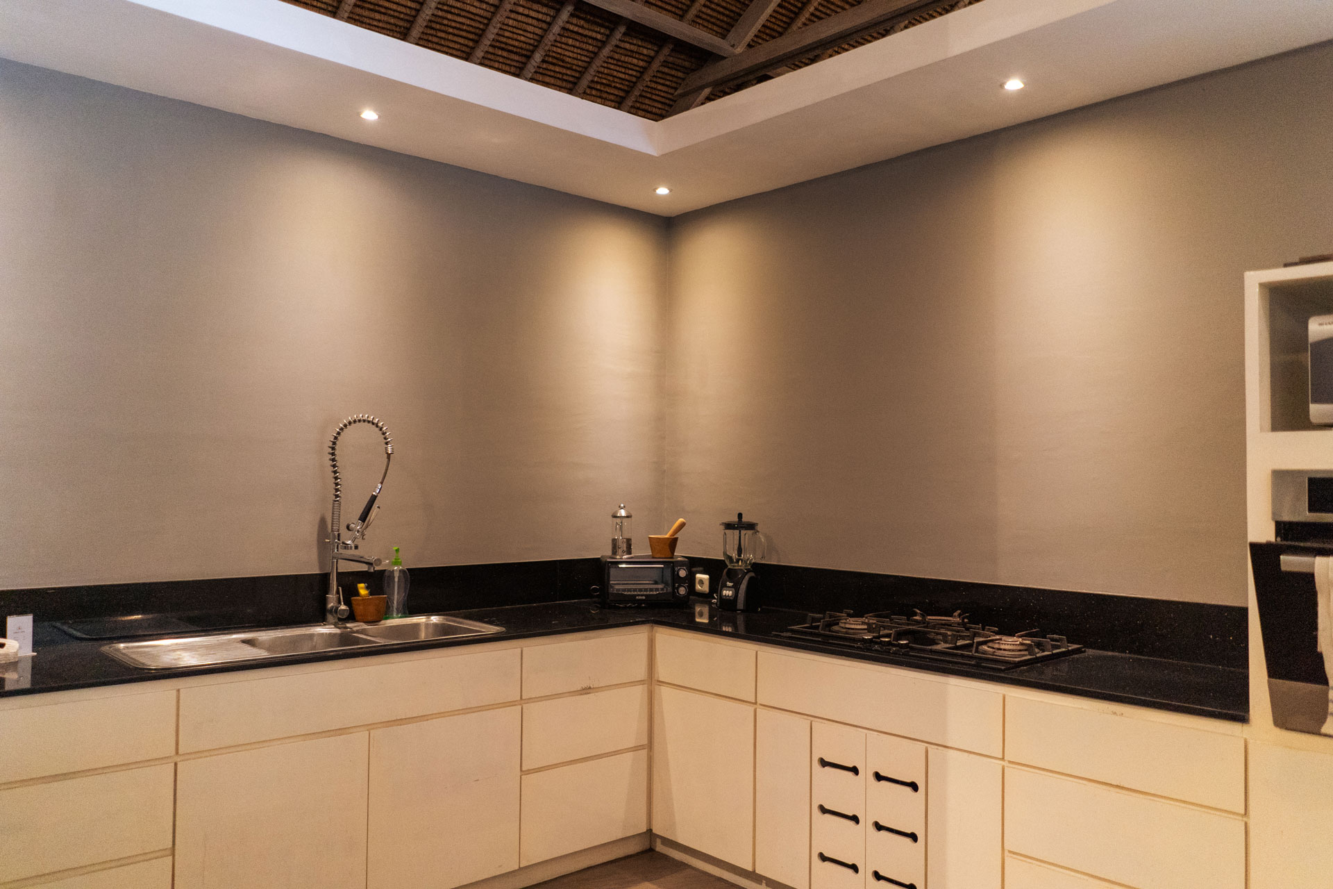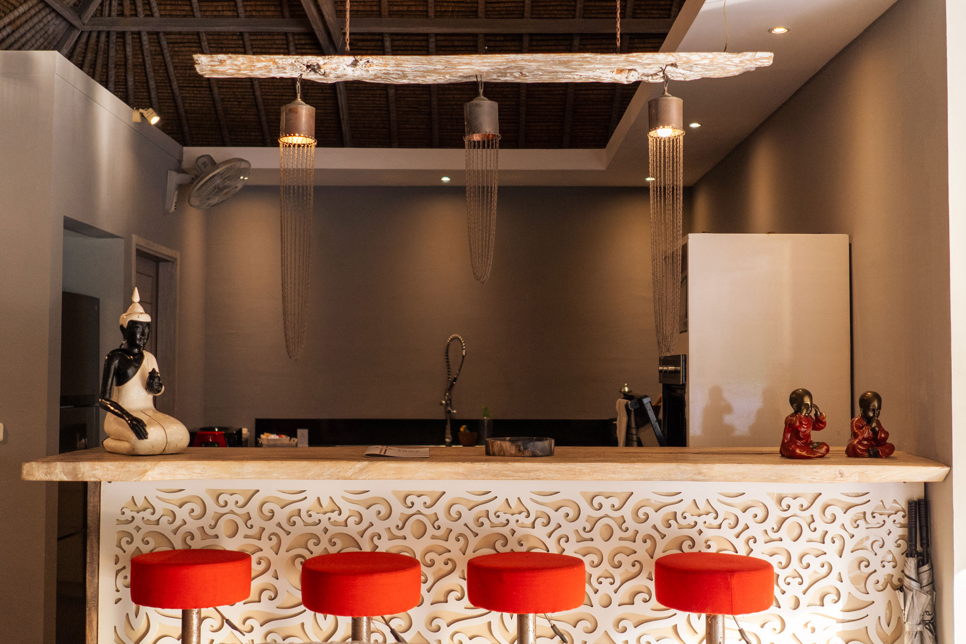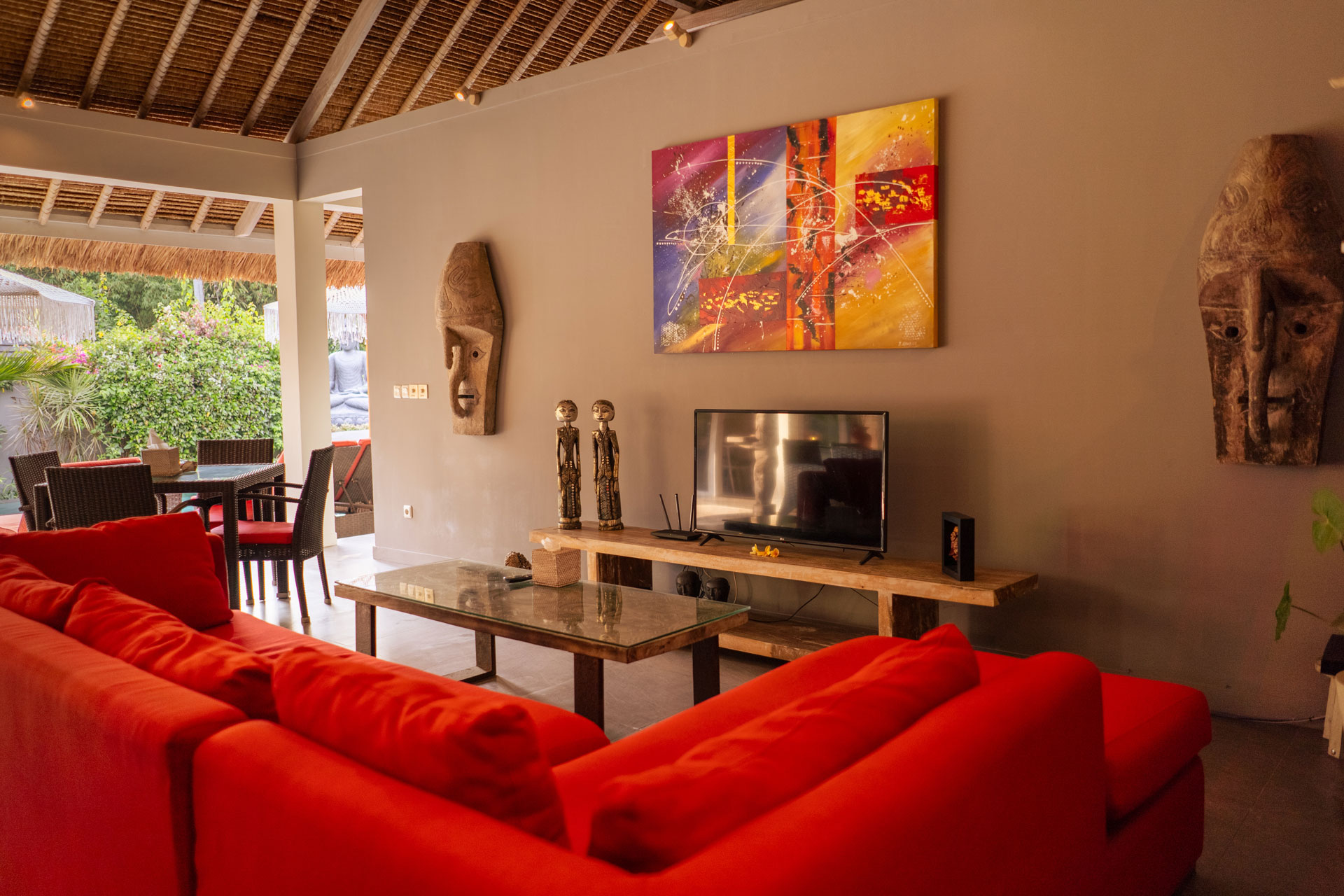Our 420 sqm 3 bedroom villa with a large private swimming pool and a very well-equipped modern kitchen. Experience dining at a villa that is prepared by a private chef based on your request. A wonderful dining area and living room with flat screen TV. King size bed with mosquito net and a wide outdoor bathroom area in all rooms.